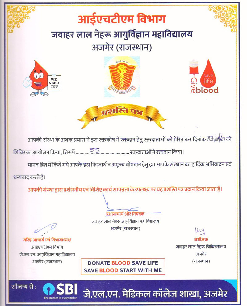 • The blood donation unit of J.L.N.Hospital Ajmer, had come to SVMM. Roopangarh to collect the blood. All our students, teachers and villagers had come forward to donate blood. After collecting the blood, certificates of appreciation has given to the blood donor by the members of the blood donation unit. Volunteer or the donors did not accept any kind of monetary benefits.
